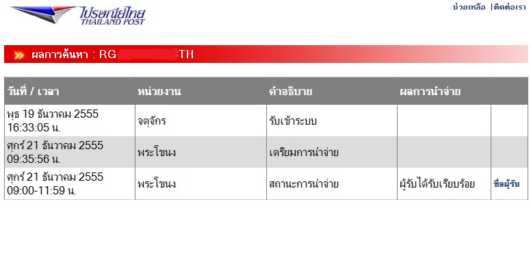 หมายเหตุ : การจัดส่งแบบพัสดุลงทะเบียน รหัสนำหน้าเช่น RA/RB/RC/RD สามารถตรวจสอบสถานะของพัสดุทางเวปได้ตลอดเวลา ใช้ระยะเวลาในการจัดส่ง 2-3 วัน ดูตัวอย่างตามรูปด้านล่างต้นทางและปลายทางอยู่ในกรุงเทพ