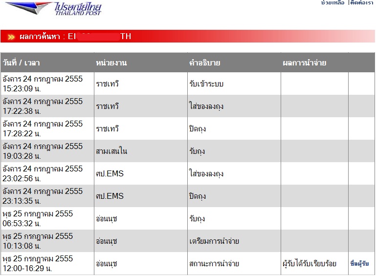 หมายเหตุ : การจัดส่งแบบพัสดุด่วน EMS รหัสนำหน้าเช่น EA/EB/EC สามารถตรวจสอบสถานะของพัสดุทางเวปได้ตลอดเวลา โดยปกติแล้วถ้าส่งวันนี้จะได้รับภายในวันรุ่งขึ้นไม่เกิน 16.30 น. (ยกเว้น จังหวัดแม่ฮ่องสอน อำเภอเวียงแก่น จังหวัดเชียงราย อำเภอเวียงแหง จังหวัดเชียงใหม่ และ อำเภอสุคิริน จังหวัดนราธิวาส ถึงภายใน 2-3 วัน)